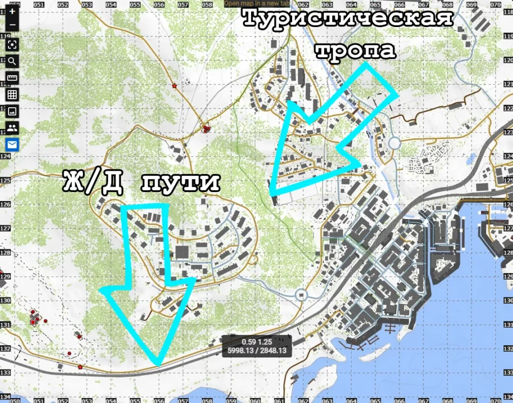 Если у Вас в игре нет карты, то Вы можете посмотреть на нашем сайте онлайн карту, на ней отмечены туристические тропы зелёной линией, а ж/д пути чёрно-белой зеброй.