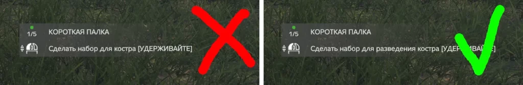 Теперь совместите кору и короткие палки (достаточно 1 палки, но можете совмещать и 3, и 5, не важно) и обратите внимание что Вам предлагают два варианта крафта, “Сделать набор для костра” и “Сделать набор для разведения костра”, не перепутайте. Чтобы сменить тип крафта, покрутите колёсиком мыши.
