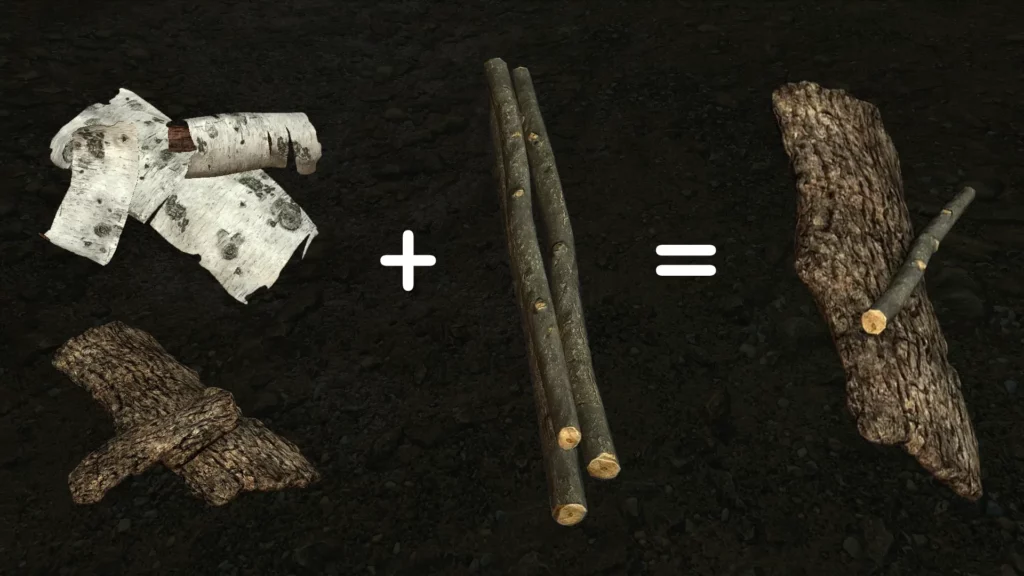 Чтобы разжечь костёр в DayZ без спичек и зажигалки нам понадобится набор для разведения костра, его можно скрафтить из коры дерева и короткой палки.