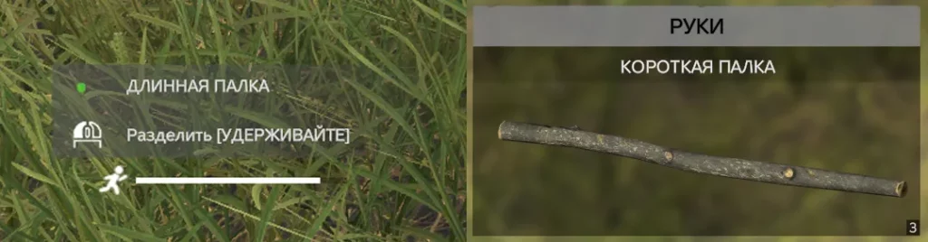 После окончания анимации сбора у Вас под ногами появится длинная палка. Возьмите её в руки, и Вы увидите в левом нижнем углу экрана надпись “Разделить”. Зажмите ЛКМ и ваше персонаж сделает из длинной палки 3 коротких.