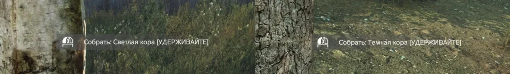 Возьмите один из предметов в руки и подойдите к дереву, когда появится надпись “Собрать: Светлая кора” или “Собрать: Темная кора”, зажмите ЛКМ и дождитесь пока пройдёт кружок, означающий действие, за каждый проход круга, на землю будет падать 1 кусок коры.